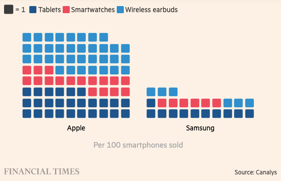 促使人们留在苹果设备的生态系统中,就促进了其业务的发展。根据市场情报机构Canalys的数据,在全球范围内,每售出100部iPhone,苹果就会售出26部iPad、17部Apple Watch和35副Airpods。相比之下,三星每100部智能手机仅售出11台平板电脑、6块智能手表和6副无线耳机。