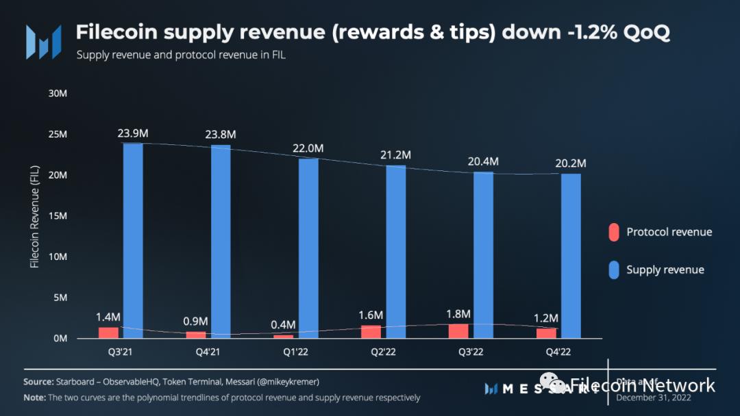 供应端的收入在22年第四季度降低了1.2%,是2020万个FIL,这主要是因为网络降低了整体的回报率。虽然22年第四季度实现了基准的增长目标,但因为前述提到的指数衰减模型的原因,整体的FIL铸造率下降了不少。值得注意的是,从21年第四季度,投入的存储容量增长率出现了下降(据Filecoin关键指标概览表),而供应端的收入也是如此。