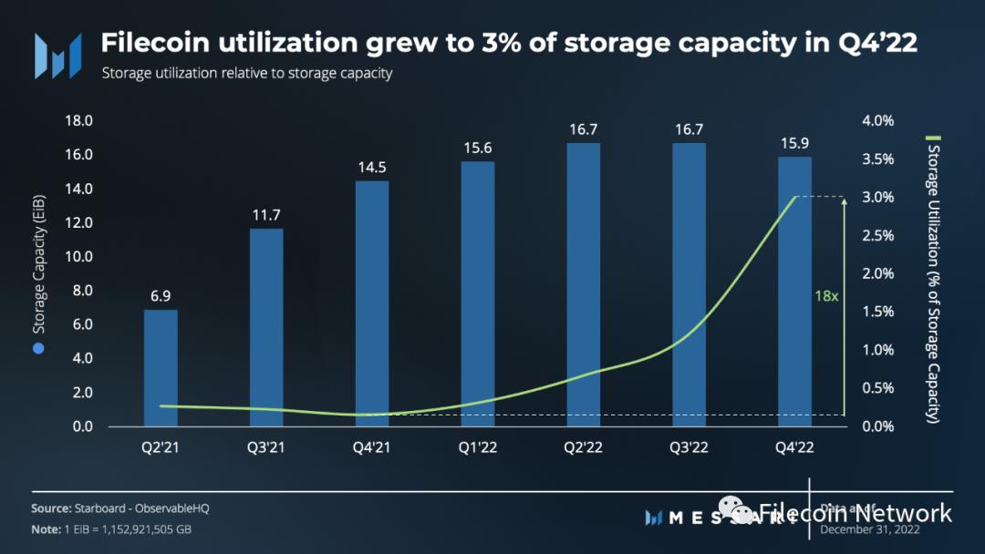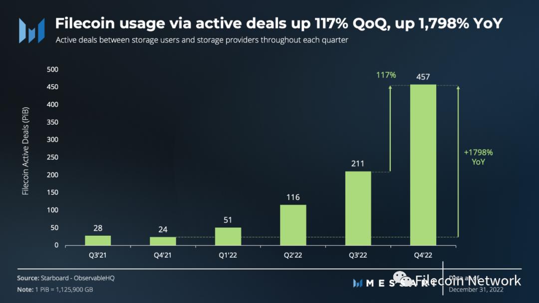 - Filecoin的存储市场在22年第四季度持续增长,活跃存储交易提议比上一季度同期增加了117%,比上一年同期增长了1,798%。