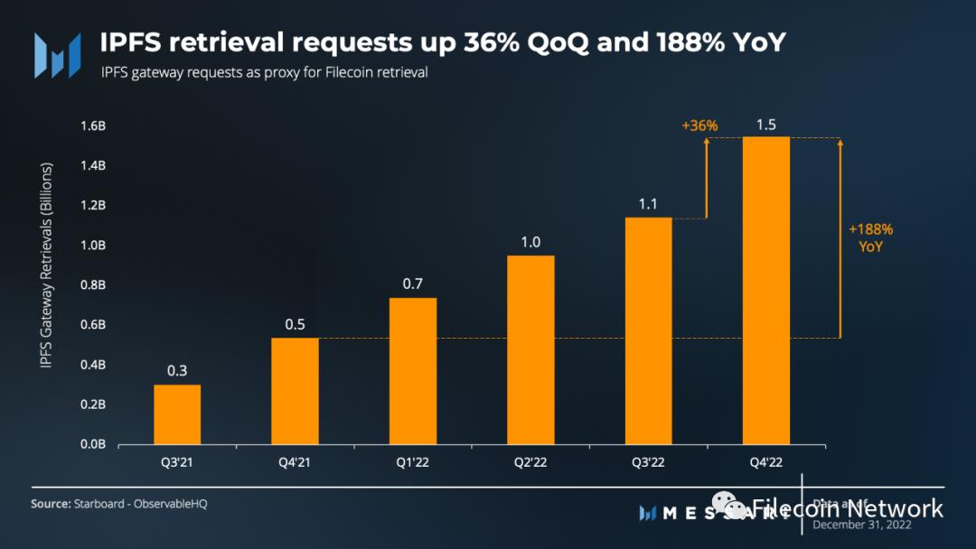 相比于22年第三季度,检索请求的数量在22年第四季度增加了36%. 与去年同期相比,检索请求增加了188%. 这个增长的趋势是合理的,因为流行的存储开发者工具(如NFT.storage和Web3.storage,都依赖于IPFS来存储和检索)的使用率有了提升。随着检索市场在持续开发,在IPFS网关以外,还会有新的指标来追踪这些数据。