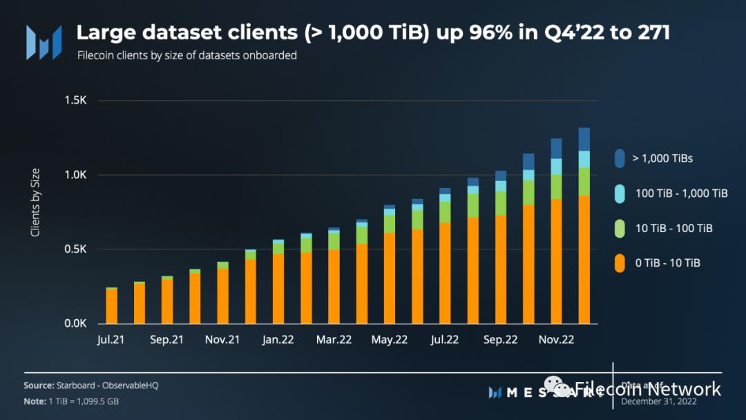 在22年第四季度末,总共有1,320名用户在Filecoin上存储了数据集,其中271名是存储了大型数据集(如容量超过1,000 TiB的),这比22年第三季度的138名用户增加了96%。Filecoin的用户包括了纽约市和USC Shoah基金会, 还有像OpenSea这样的Web3平台。另外还有一些值得注意的项目也在往Filecoin网络上存储数据。