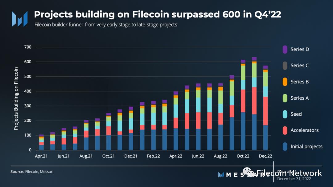- 在Filecoin、IPFS 和协议实验室网络上搭建的项目,在22年第四季度增长到了600个,比22年第三季度的500个有了大幅提升。