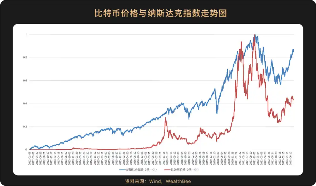 我们选择伦敦现货黄金(XAU)作为黄金价格走势锚定来分析。黄金属于典型的避险资产。从图中看,在 2016 年之前黄金价格在逐步降低,但比特币价格却在缓慢升高。随后二这走势呈现趋同性,在 2018 年二者均达到阶段高点,2020 年 8 月,黄金价格达到最高点随后回落,但比特币价格却在之后迅速走高,进入大牛市。比特币价格巅峰恰恰是黄金价格的阶段性低谷(2021 年)。但在 2022 年 11 月之后,二者同时触底反弹,走势上表现出一致性。