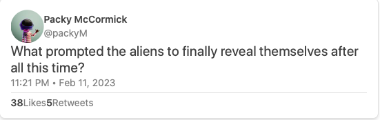 前几天,Packy在推特上口无遮拦地问,是什么最终让外星人对人类产生了足够的兴趣,从而暴露了自己: