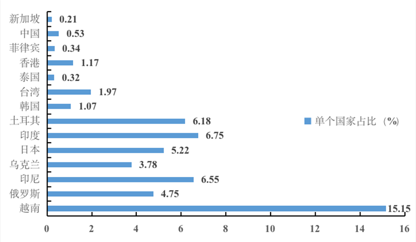 各平台亚洲用户占比基本达到50%,其中Pyme最高,含亚量达到60%。而越南在这五个平台中平均排名第一,占比19%。第二梯队印尼、印度和土耳其占比7%-8%。第三梯队俄罗斯、乌克兰和日本占比5%左右,其他地区不足3%。