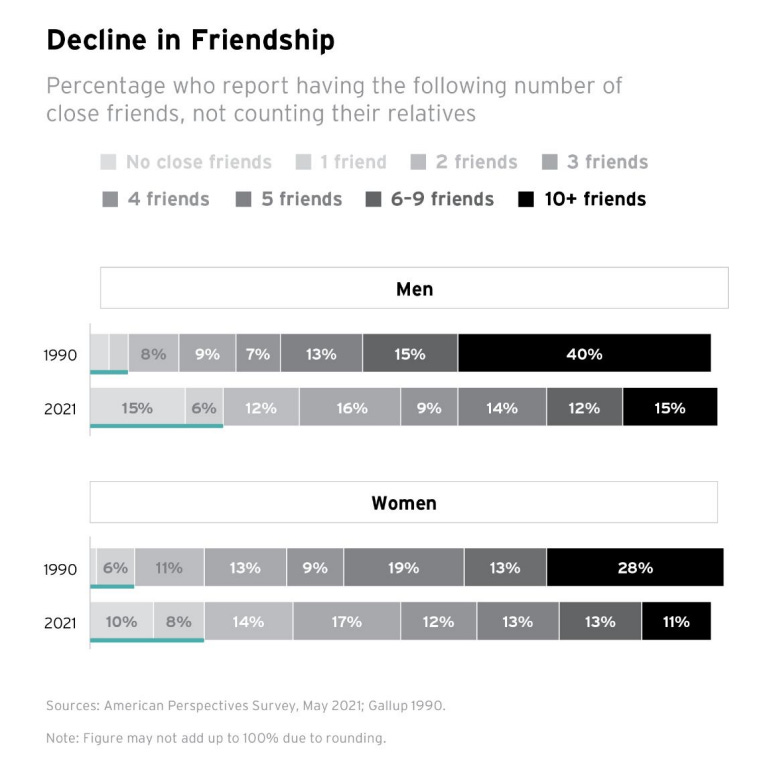 在过去的几代人中,美国的教会成员和社区中心等“第三场所”的成员数量急剧下降。家庭规模正在缩小,越来越多的美国人开始独居。这恰逢互联网的兴起——我们可能拥有比以往任何时候都更松散的社交联系(我们通过Facebook和Instagram与他人保持联系),但我们的深层社会联系却更少了。这一代人面临的挑战之一是改变方向,更好地利用技术来增强人与人之间的联系,而不是完全取代它。