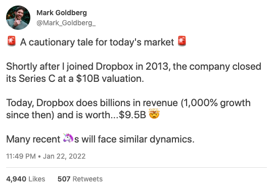 在2021年,创业公司以50倍甚至100倍的ARR倍数融资的情况并不罕见。许多公司将很难以发展到这样的估值水平。正如Gil所指出的那样,一家以50倍ARR融资的公司需要9年的时间,每年增长20%,才能达到目前的估值(假设退出倍数为10倍)。一家以100倍ARR融资的公司需要6-7年的时间,每年增长85%,才能达到上一轮的价格。这就更不用说是下一轮融资的2-3倍的估值了。