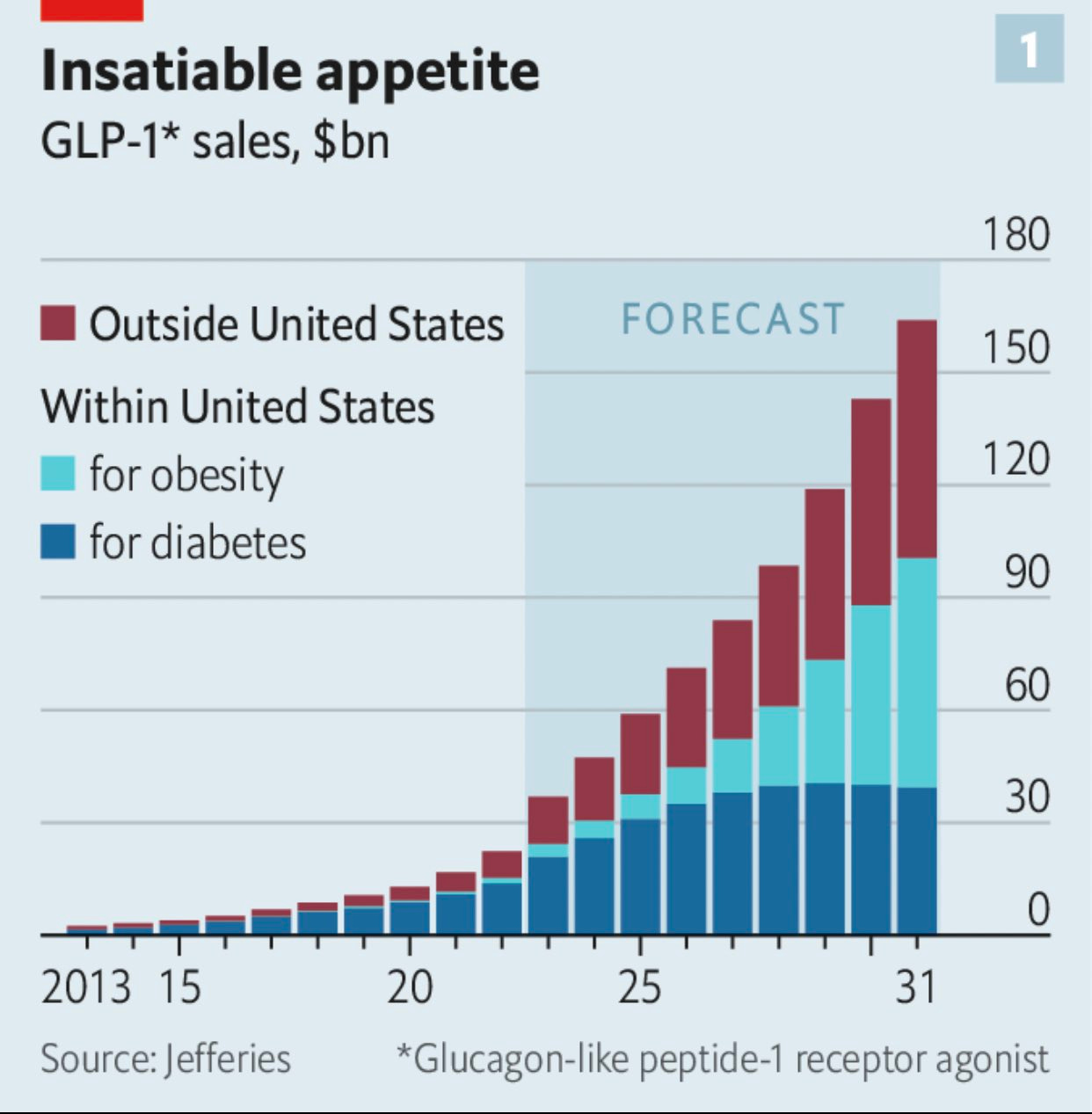 《经济学人》估计,到2031年,GLP-1药物的市场规模将超过1,500亿美元。从长远来看,这与用于治疗癌症的药物的市场规模相当(2021年为1,850亿美元)。我预计这里将为有进取心的企业家提供各种机会——制药公司肯定会获胜,但也会有“Ozempic影响者”和“Wegovy教练”的生态系统,获得减肥药物的在线管理市场。