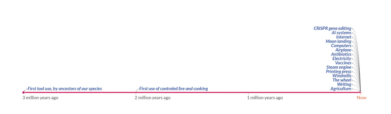 当你缩小视野时,会发现大部分的人类创新发生的时间都是非常接近的。我们花了很长时间才学会如何使用工具;我们又花了一百万年来学习如何控制火;又花了一百万年来教会自己农耕。