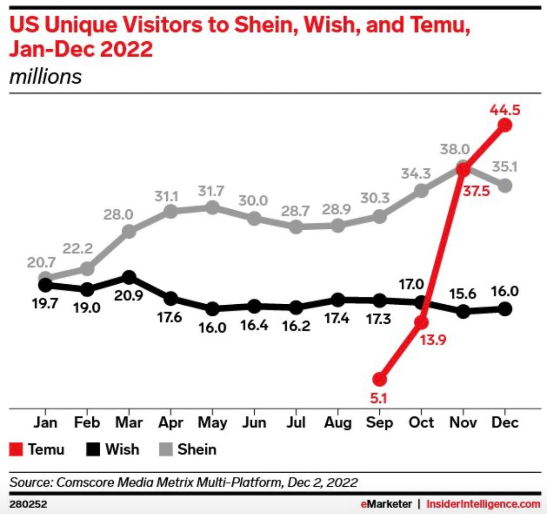 类似的创业公司是Temu,实际上是一家在线美元商店,由中国电商巨头拼多多所拥有。去年12月,也就是推出仅四个月后,Temu的独立访客数量超过了SHEIN和Wish。