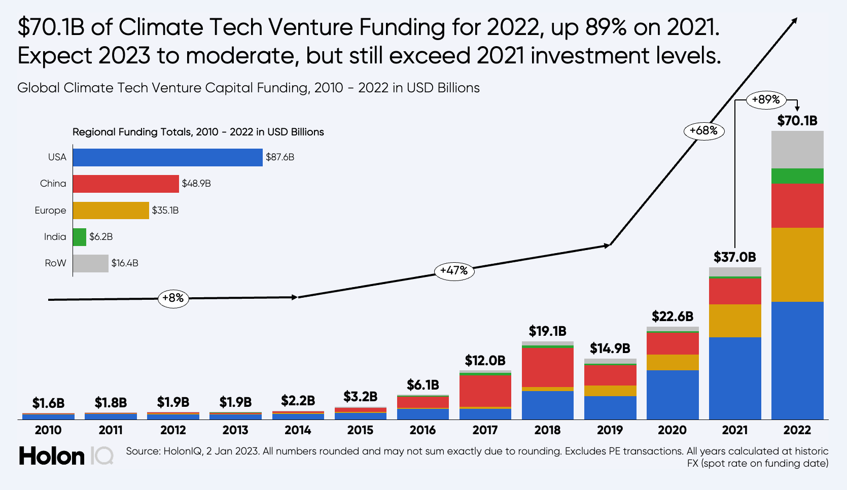 2021年,气候技术领域的风险投资激增至创纪录的370亿美元,比2020年增长了64%。去年,随着更广泛的融资市场降温,这种增长实际上加速了:根据HolonIQ的数据,气候技术创业公司在2022年筹集了701亿美元,同比增长89%。