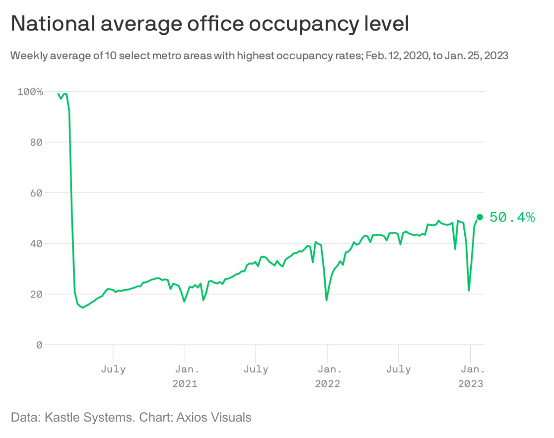 2020年3月,一夜之间,办公室占用率从100%骤降至约15%左右。三年后,全国办公室占用率仍未恢复:现在,占用率为50%。