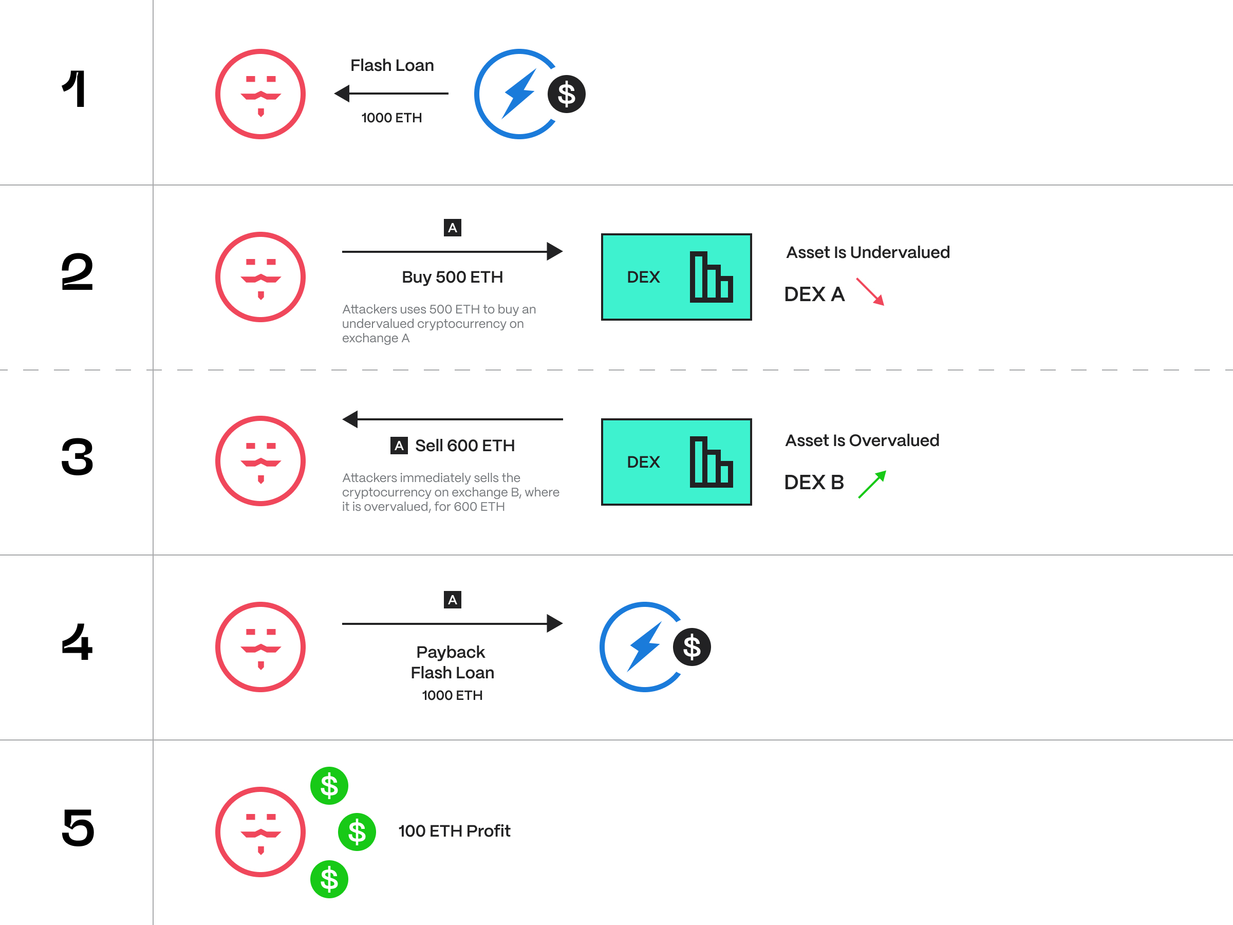 这是闪电贷套利攻击的一个例子。这种攻击利用不同交易所之间的价格差异来产生利润。套利本身并不具有恶意性;许多交易者使用闪电贷进行合法目的。但是,当用来通过加剧DeFi智能合约中的漏洞来窃取协议中的资金时,就变得具有恶意性。