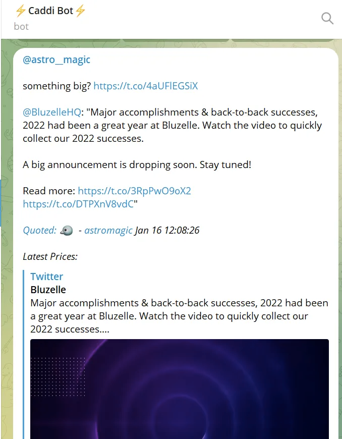 - 在这里,astro_magic转发了Bluezelle($BLZ)的一则重大公告,在8分钟内增长了15%。很明显,它在之后直接回调,但如果执行速度快,你至少应该能够从中抓住几个百分点。
