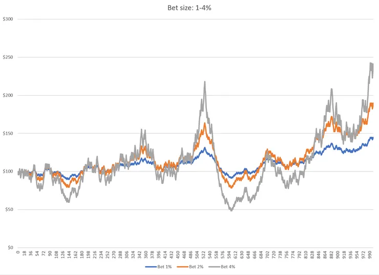 假设我的交易风险/回报是1:2(这意味着如果我错了,我可能会损失1个单位,但如果我对了,我会赢得2个单位)。从长远来看,只有这样的交易才应该是一种获胜策略(如果你对1:2交易的判断显然是正确的)。