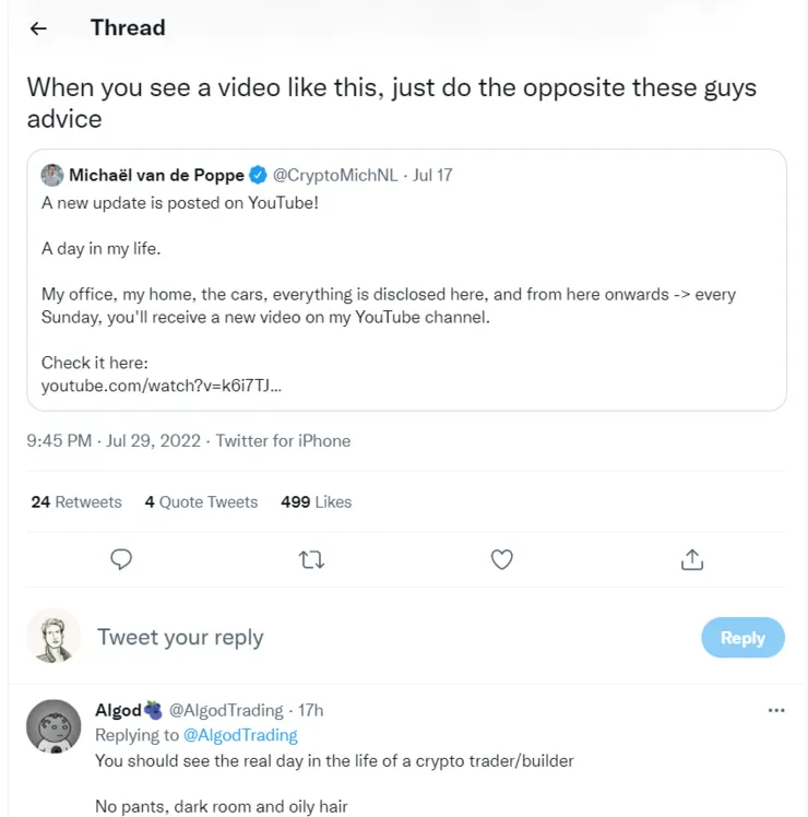 Algod的观点是,每天都有汽车和派对的浮华生活不是真的(至少对99%的交易员来说是这样),而是在黑暗的地下室里磨练,好几天没有阳光,不断浏览TG/Discord/Twitter/盯着图表看,不参与“正常”的生活等等。