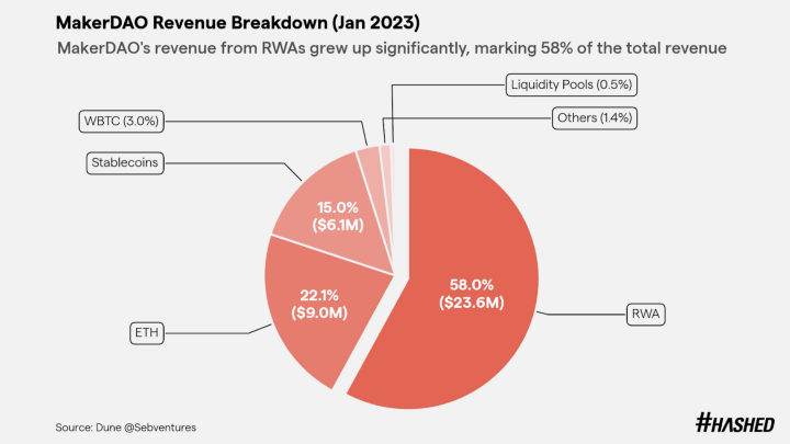 目前,真实世界资产(RWA)最成功的应用是稳定币,市场领导者包括USDT、USDC和BUSD等市值最高的七个代币。加密原生组织在RWA方面表现出明显的主动性,比如MakerDAO投资了5亿美元的美国国债和公司债券,并分散投资于其他类型的RWA,如房地产、发票和商业贷款。RWA现在占Maker总协议收入的近60%,足以体现这一领域的潜力。