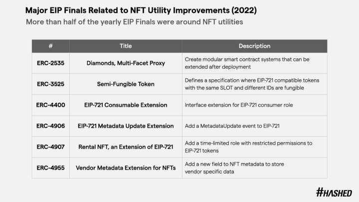 在过去的几年里,NFT的格局发生了巨变,特别是那些以个人资料图片(PFP)形式存在的NFT。然而,在2022年下半年,基于图像的NFT的交易量明显减少,因为用户已经开始渴望获得更多的功能。因此,NFT生态系统正在通过转型来应对这种变化的需求。以太坊改进提案已经成为衡量以太坊社区发展方向的标准,最近的大多数提案都集中在NFT标准上,表明社区希望拥有具有额外效用的NFT。我们相信,2023年将是关键的一年,各种NFT,包括动态NFT,将通过提供新功能来解决这些问题。
