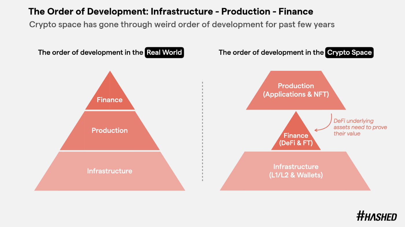 然而,直到2022年,加密货币经济仍缺乏这种平衡,基础设施层面的项目,如加密货币交易所和货币市场崩溃(金融),导致金融市场不稳定,影响公用事业和社区的项目无法蓬勃发展(生产)。加密经济的基础,即区块链技术(基础设施),已经到位,但需要更多以生产为重点的项目的发展来支持其增长。