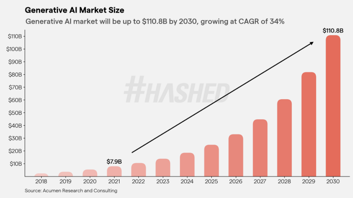 生成式人工智能已经是一个发展了很久的领域,但直到最近,它才进步到足以模仿甚至超越人类在图像、语言和语音识别方面的能力。该市场在2021年的估值为80亿美元,预计到2028年将达到630亿美元以上。作为这一领域的狂热投资者,我们对它在未来几年将如何继续塑造和创新行业有很大兴趣。