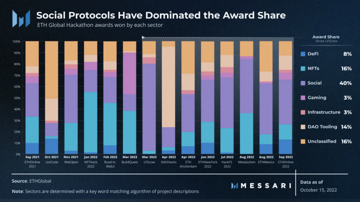 去中心化的社交网络在一整年的黑客马拉松中一直是一个增长的趋势,40%的获奖项目都属于这个类别。Lens Protocol有60多个项目完全是从黑客马拉松中衍生出来的,围绕着他们的社交图谱进行了不同的尝试。Farcaster和DeSo在这种巨大的兴趣中分别筹集了大量的资金。今年,我们可以期待看到基于区块链的社交应用的初步发展,这些应用通过使用共享的社交图谱来利用网络效应。