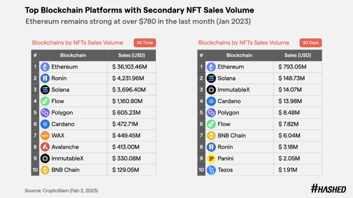 此外,数字产品也正在慢慢兴起,包括通过L1区块空间产生的非同质化资产。以太坊是现有最大的智能合约平台,在上一个NFT夏季之后,仍在产生大量的NFT交易,总交易量超过350亿美元。尽管NFT社区的活动减少,OpenSea的交易量也在下降,但二级NFT交易仍然强劲,每月超过7.8亿美元。