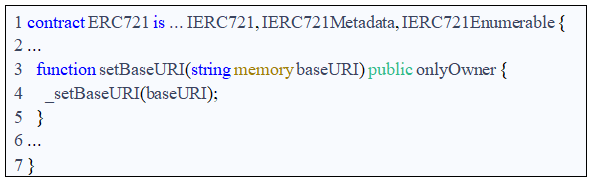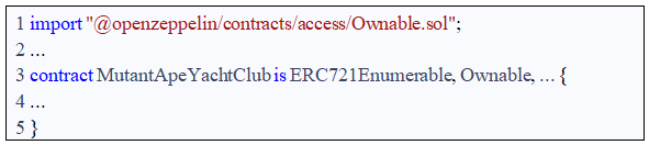 创建一个基本的NFT在机械上是很简单的。创建者可以简单地通过复制或引用NFT开发者发布或使用的开源软件(“OSS”来制作智能合约。Open Zeppelin 发布的“Ownable”智能合约是主流 NFT 项目中使用的众多流行 OSS 库之一。例如,MutantApeYachtClub(“MAYC”)的智能合约继承自Ownable,只需声明MAYC智能合约是Ownable智能合约(图3中的第3行):