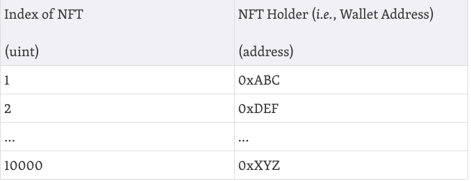 标识索引编号从1到10,000列出,反映了该系列中单个Punk nft的总数。简单地说,每个单独的NFT只作为一个索引号存在于智能合约中,它构成了实际“不可替代”(唯一)代币,与NFT持有者的钱包地址绑定。例如,当人们将“Punk1”作为系列中的一个离散NFT时,他们指的是这个查找表中的索引号1。当一个终端用户获得一个NFT时,她的钱包地址只会映射到智能合约中构成该NFT的索引号。