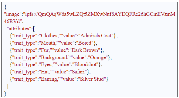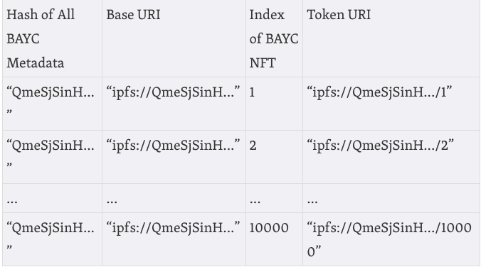 从机制上讲,IPFS经常与NFT项目一起工作,情况如下。项目的创建者将图像和其他元数据的集合上传到IPFS,IPFS以一个叫做“基础URI ”的URI的形式返回该集合的唯一哈希。整个图集的元数据可以通过基础URI访问。为了获得馆藏中某一特定NFT的元数据,被称为标记URI,NFT的索引号被附加到基础URI的末尾,形成“标记URI”。