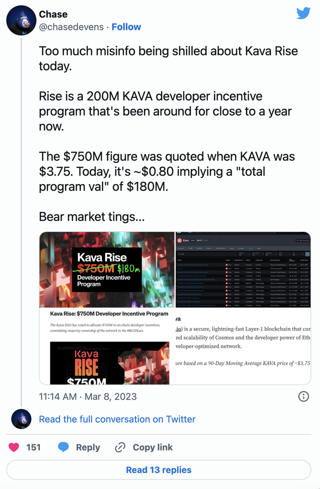 Chase 澄清了一些关于 Kava Risa 的错误信息。提醒始终尽职调查