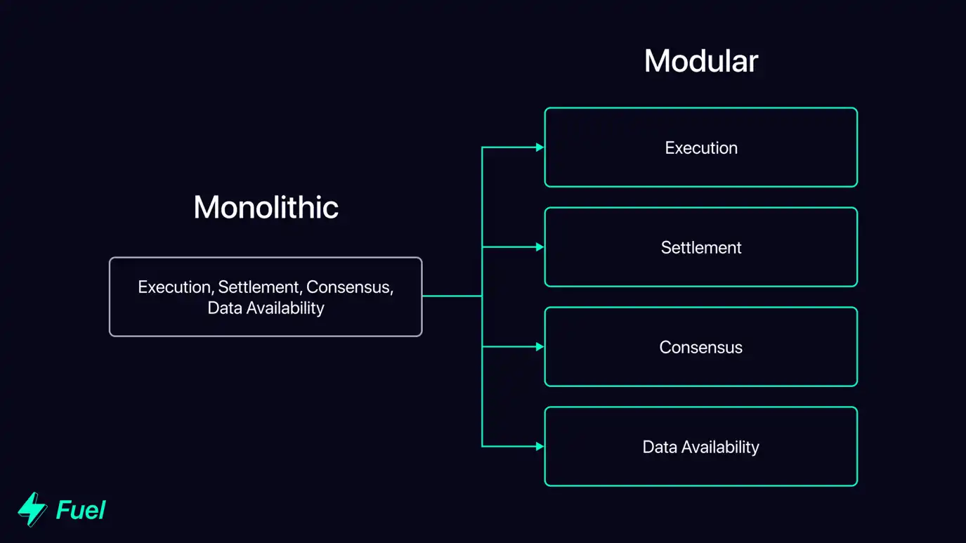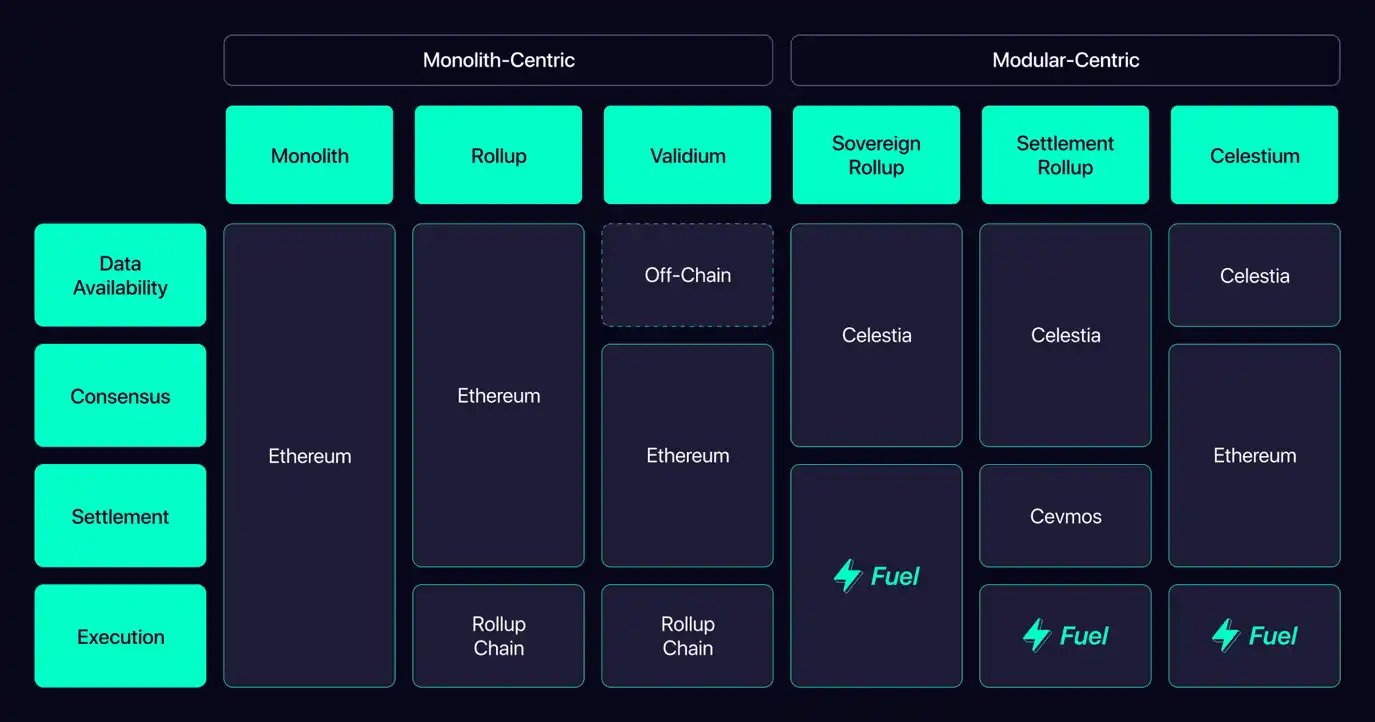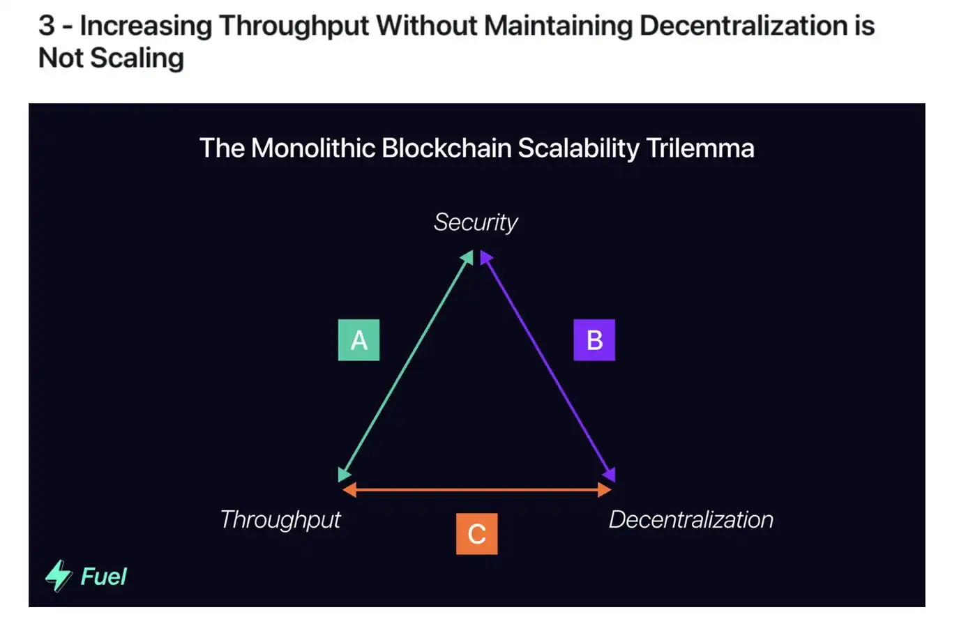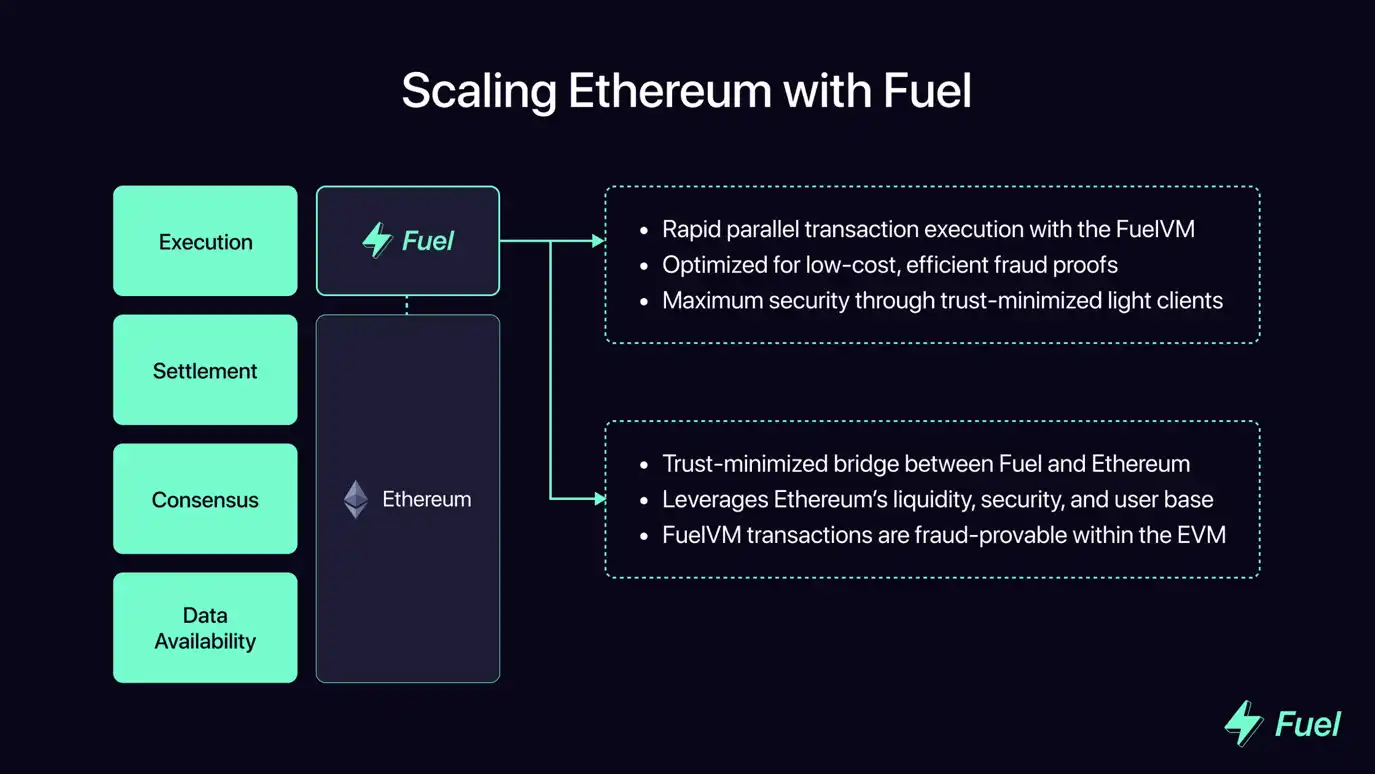 接下来通过谈论 Fuel Labs 来结束这个话题,Fuel Labs 正在构建一个可与以太坊和 Celestia 实现的执行层,保持高安全性和去中心化的前提来扩展吞吐量。