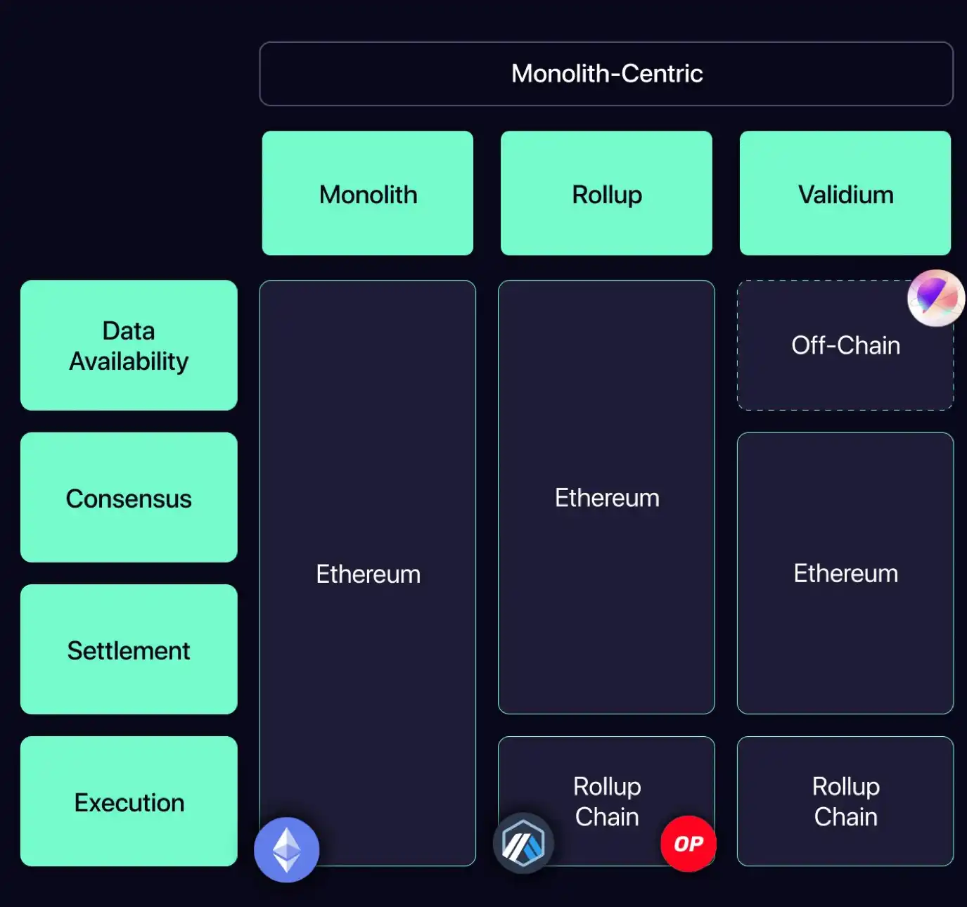当前以太坊上的 Rollup(例如 Arbitrum、Optimism)充当执行层,并通过以太坊主网实现数据可用性层、共识层和结算层,这些 Rollup 在将使用「链上数据可用性」将数据发布到指定的 L 1(以太坊)上。
