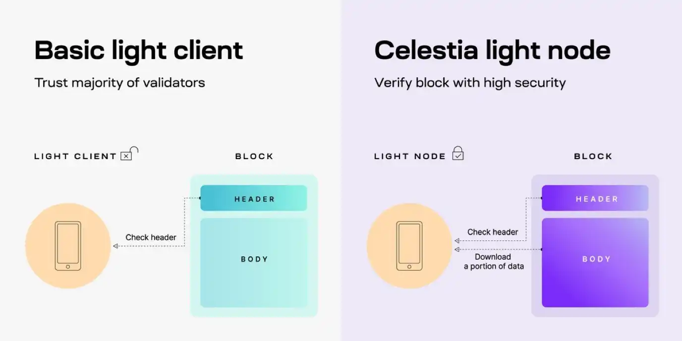 比如,Celestia 的轻节点通过下载一小部分数据来使用数据可用性抽样,他们依赖「少数诚实假设」(假设少数区块链交易者诚实并遵守协议规则),这就会大大提高安全性。