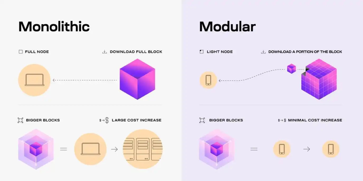 模块化区块链是将这 4 层中的一个或多个外包给外部链的链,由于模块化区块链可以专注于特定元素,因此可以达到新的可扩展性水平。