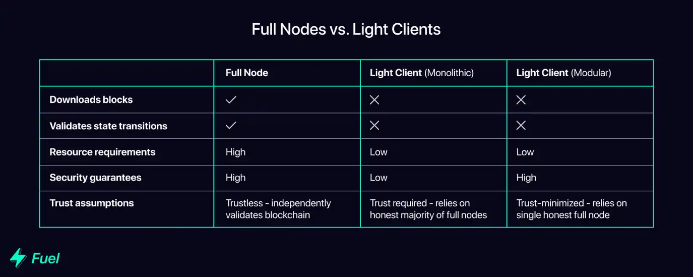 再回到轻客户端身上,我此前说过,就硬件要求而言,轻节点的成本要低得多,但由于它们靠着「多数诚实假设」,安全性会降低。
