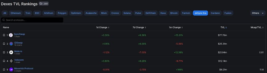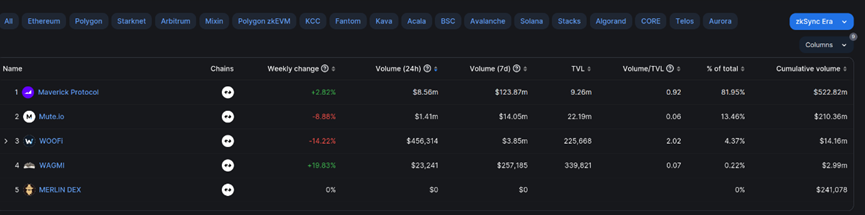 Maverick目前已在主网、zkSync和BSC上上线。值得注意的是,尽管只有一小部分竞争对手的总锁定价值(TVL),Maverick在zkSync上的交易量占主导地位: