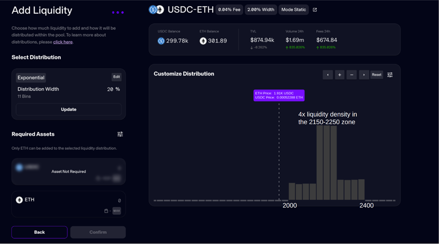 然而,对于那些具有更精细观点的LP来说,该怎么办呢?比如,如果LP在这个价格范围内看到ETH的时间很少,主要集中在$2150到$2250区间,他能否通过选择适当的流动性结构来表达这个观点呢?这正是Maverick的作用所在: