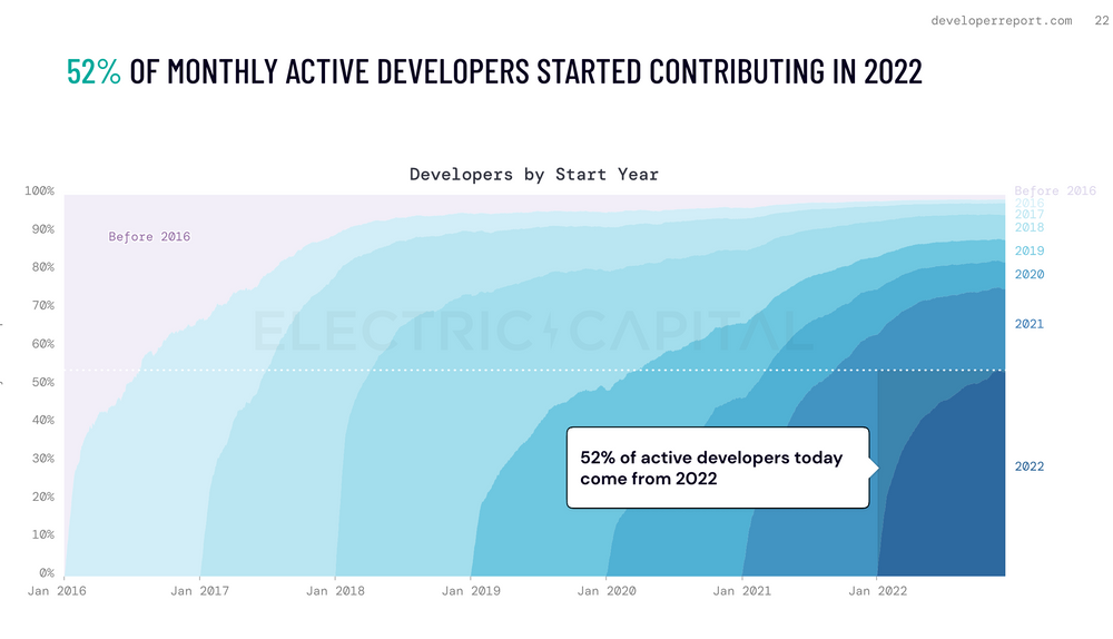 Electric Capital 的《2022 年开发者报告》很好地概述了区块链开发生态系统的状态。尽管 2022 年是加密货币和科技股的熊市,但开发者数量逐年上升。