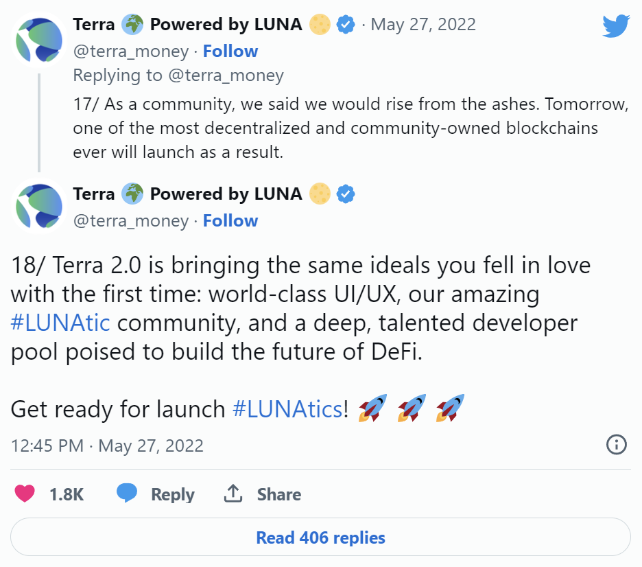 l 5月13日:Kwon提出了一个“复兴计划”,将所有权转让给用户和持有人,并公开承认Terra/Luna的崩溃。