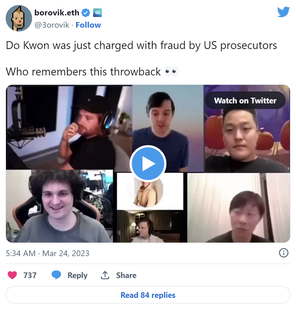 l 3月23日:在他被捕几个小时后,纽约联邦大陪审团对Kwon提出了8项指控,包括证券欺诈、商品欺诈、电信诈骗和共谋等。