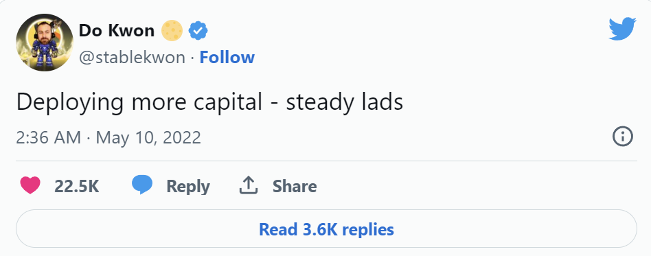l 5月9日:UST成为头条新闻,从0.985美元跌至0.35美元,摧毁投资者数十亿美元的市场价值。Kwon著名的推文“部署更多资本——坚定的伙计们”随后很快就成为了一个梗。