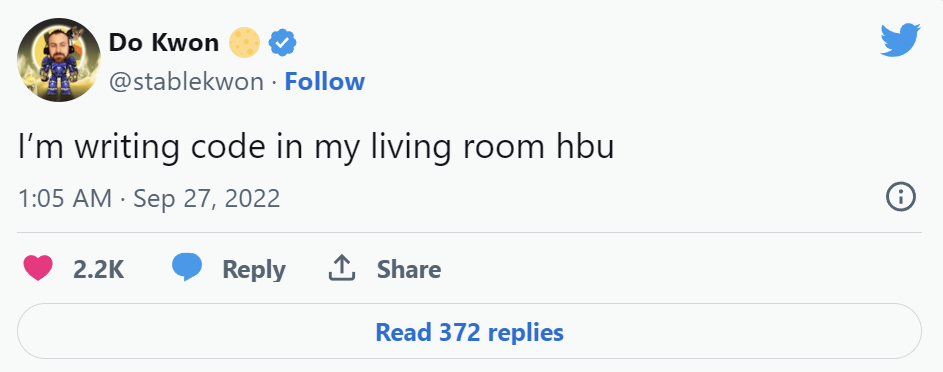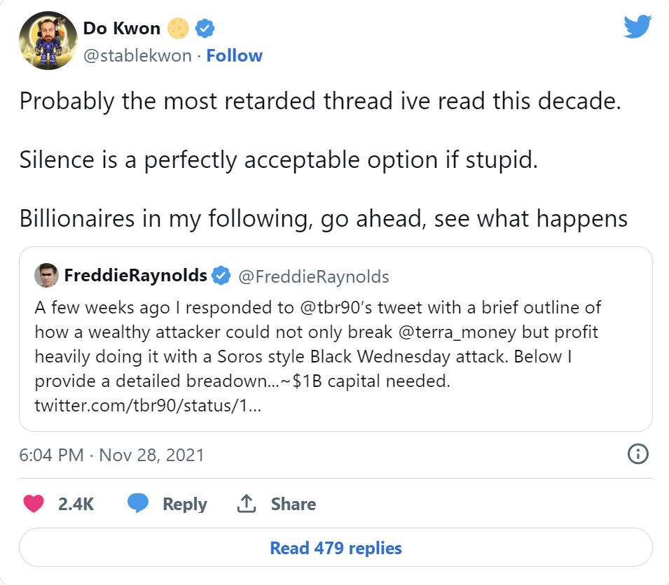 l 11月,针对Luna/Terra可能遭受鲸鱼攻击的准确预测的回应,Kwon称之为“我这十年读过的最愚蠢的帖子”。