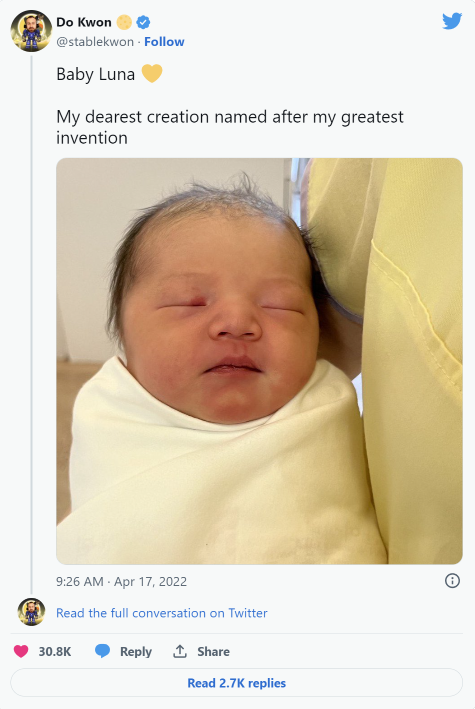 l 4 月 17 日:Kwon 在一条推文中宣布,他已将刚出生的女儿取名为Luna。他补充说:“如果我有一个儿子,我会给他起名叫Stable。