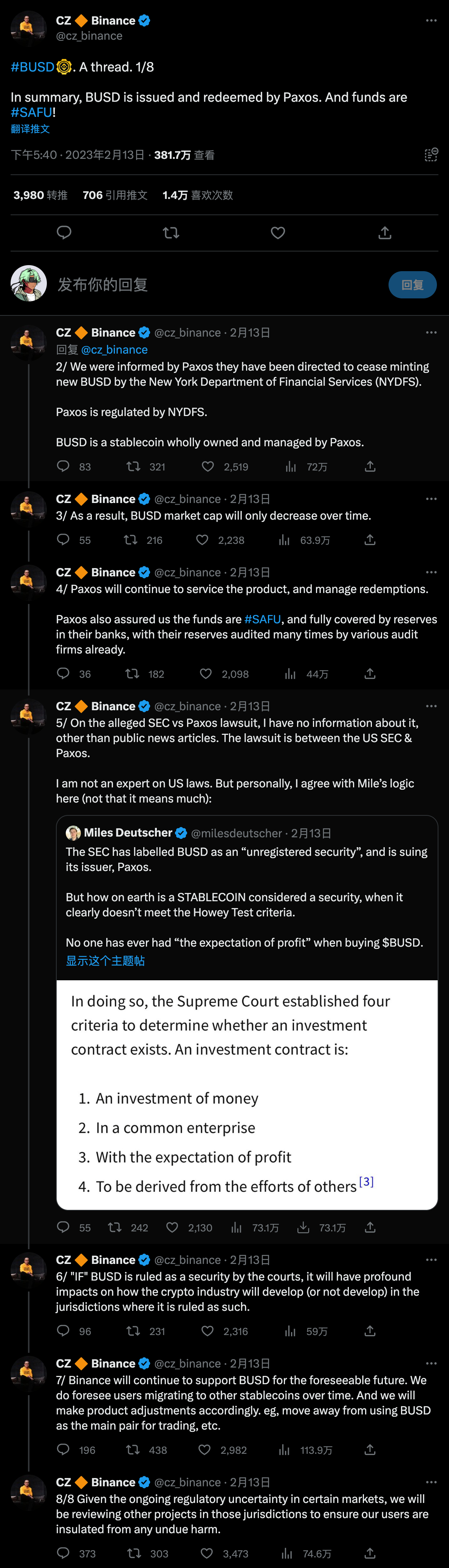 2023年2月13日:稳定币发行商Praxos披露收到美国证券交易委员会的通知,称稳定币Binance USD,即BUSD是一种证券。监管机构命令Paxos停止铸造该代币。Paxos回应说,它将结束与主要交易所Binance的关系,停止铸造BUSD稳定币。为了安抚投资者,Binance首席执行官赵长鹏CZ后来在Twitter上说:“资金是安全的。”