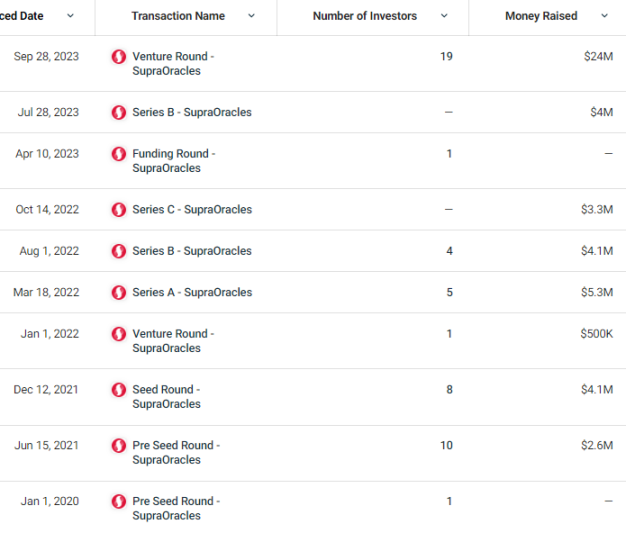 2023 年 9 月 28 日,据 Chainwire 报道,预言机与 VRF 服务提供商 Supra 宣布迄今已完成超 2400 万美元融资,投资者包括 Animoca Brands、BCW、Coinbase Ventures、FiveT Fintech(原 Avaloq Ventures)、Galaxy Interactive、Hashed、HashKey、Huobi Ventures、No Limit Holdings、Prosus Ventures、Razer.com、Republic Crypto、Shima Capital、Signum Capital、SMO Capital、Sound Ventures、Sublime Ventures、UOB Venture Management(大华银行)和 Valor Equity Partners。