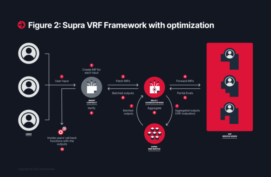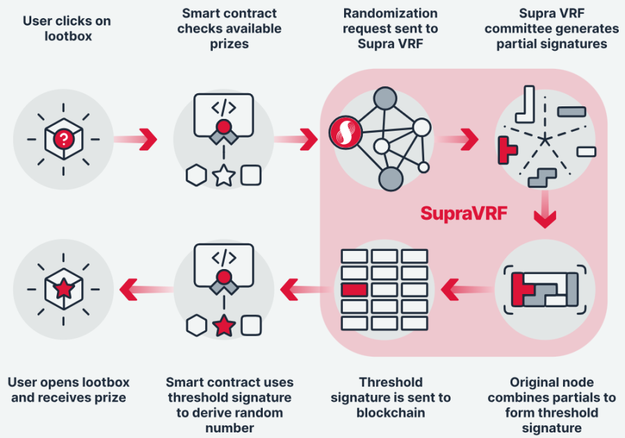 B. 与此同时,Supra 通过使用零知识证明等技术,使得输出结果看起来完全随机,又可以公开验证。这就实现了 VRF 产生随机数的目的,同时也保证了去中心性。