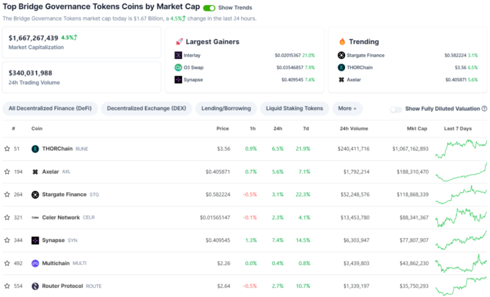 根据 CoinGecko 的数据,截至 2023 年 11 月 10 日,跨链赛道的总市值为 16.67 亿美元,占整个加密货币市场的 0.11 %。跨链技术实现不同链之间的互通,促进分布式资源优化配置,极大助推 Defi 等跨链领域商业应用发展。随着跨链生态联盟规模扩大,相应基础设施需求必将火热,将持续扩大跨链市场规模。