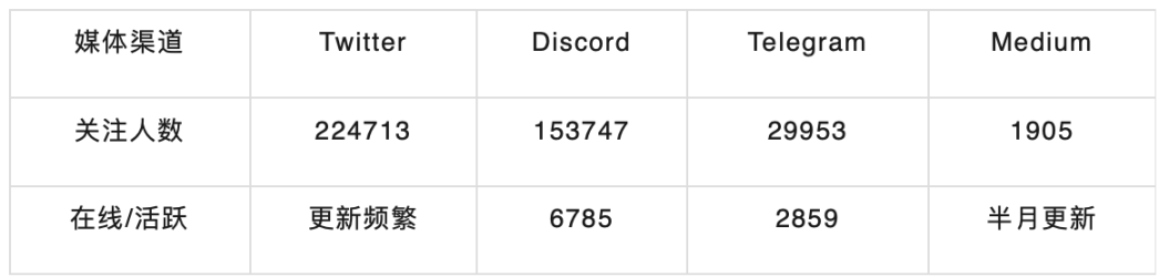 截至 2023 年 11 月 6 日,Supra 在社交媒体平台上的显示热度非常高,目前项目主要运营的渠道有 Twitter、Discord、Medium 和 Telegram 等。从社交媒体目前情况看来,在产品运营上表现不错。目前,Supra 的 Twitter 账户已经吸引了超过 22 万的关注者,更新互动频繁,是最主要的宣发路径,成为最受欢迎的渠道之一,同时 Discord 也有超过 15 万粉丝,部分栏目讨论激烈。下面是各平台的具体数据: