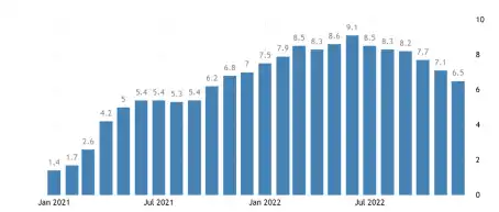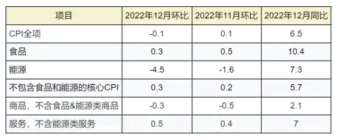 a. 12 月 CPI 同比上升 6.5%,预期 6.5%,前值 7.1%;环比下降 0.1%,预期一致,前值 0.2%;
