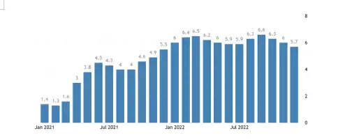 b. 不包括能源和食品的核心 CPI 同比上升 5.7%,预期 5.7%,前值 6%;环比上升 0.3%,预期 0.3%,前值 0.2%。